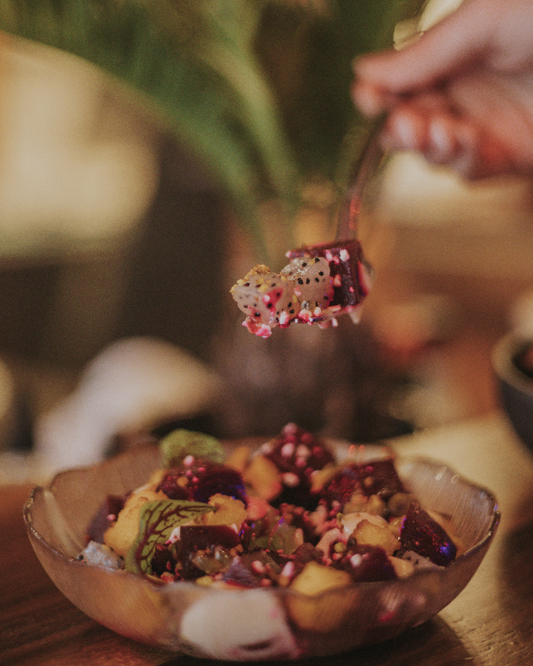 Tomates séchées, carottes rôties, champignon homard et ricotta de cajous, servis avec ketchup de pêche, salicorne et zeste de lime